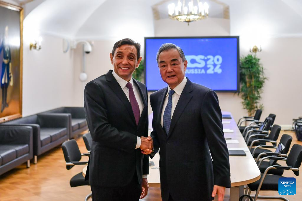 Wang Yi, a member of the Political Bureau of the Communist Party of China Central Committee and director of the Office of the Central Commission for Foreign Affairs, meets with Serbian Deputy Prime Minister Aleksandar Vulin in St. Petersburg, Russia, Sept. 11, 2024. (Xinhua/Cao Yang)