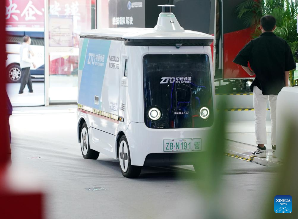 An unmanned vehicle is pictured during the 2024 China International Fair for Trade in Services (CIFTIS) at the Shougang Park in Beijing, capital of China, Sept. 12, 2024. Themed "Global Services, Shared Prosperity," the 2024 CIFTIS opened at the China National Convention Center and the Shougang Park in Beijing on Thursday. (Xinhua/Zhang Chenlin)