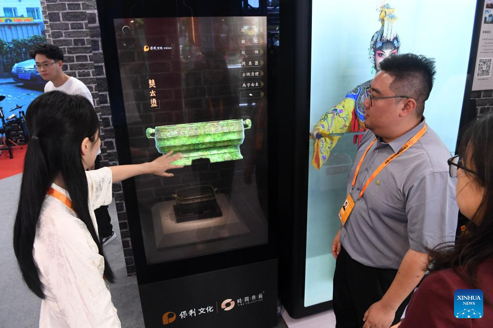 A staff member introduces a digital display case to visitors during the 2024 China International Fair for Trade in Services (CIFTIS) at the Shougang Park in Beijing, capital of China, Sept. 12, 2024. Themed "Global Services, Shared Prosperity," the 2024 CIFTIS opened at the China National Convention Center and the Shougang Park in Beijing on Thursday. (Xinhua/Ma Ning)