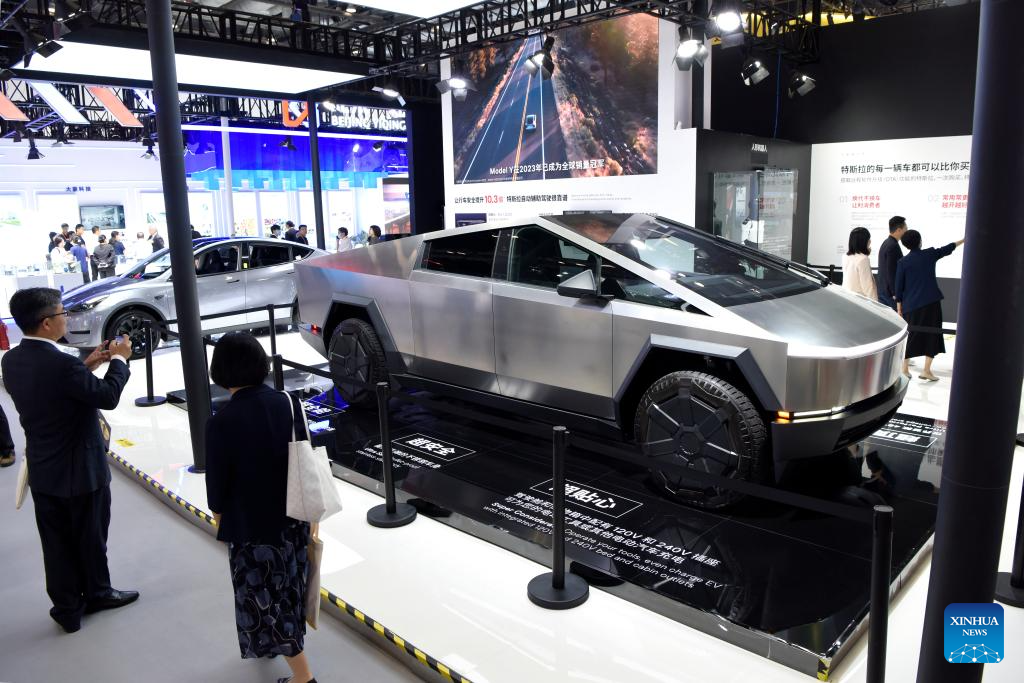 People visit the booth of Tesla during the 2024 China International Fair for Trade in Services (CIFTIS) at the China National Convention Center in Beijing, capital of China, Sept. 12, 2024. Themed "Global Services, Shared Prosperity," the 2024 CIFTIS opened at the China National Convention Center and the Shougang Park in Beijing on Thursday. (Xinhua/Wu Wei)