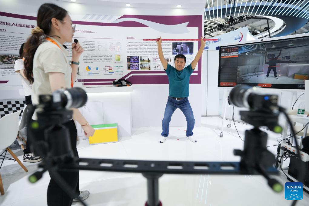 A visitor experiences an athletic ability evaluation system during the 2024 China International Fair for Trade in Services (CIFTIS) at the Shougang Park in Beijing, capital of China, Sept. 12, 2024. Themed "Global Services, Shared Prosperity," the 2024 CIFTIS opened at the China National Convention Center and the Shougang Park in Beijing on Thursday. (Xinhua/Ju Huanzong)