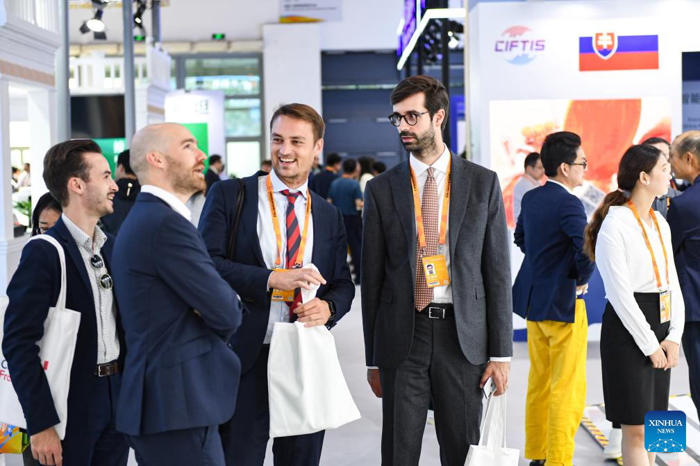 Exhibitors talk during the 2024 China International Fair for Trade in Services (CIFTIS) at the China National Convention Center in Beijing, capital of China, Sept. 12, 2024. Themed "Global Services, Shared Prosperity," the 2024 CIFTIS opened at the China National Convention Center and the Shougang Park in Beijing on Thursday. (Xinhua/Chen Zhonghao)