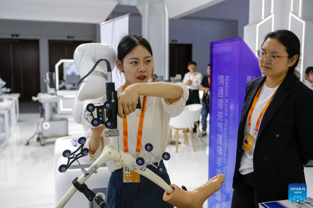 Exhibitors demonstrate a knee replacement surgical robot during the 2024 China International Fair for Trade in Services (CIFTIS) at the China National Convention Center in Beijing, capital of China, Sept. 12, 2024. Themed "Global Services, Shared Prosperity," the 2024 CIFTIS opened at the China National Convention Center and the Shougang Park in Beijing on Thursday. (Xinhua/Ding Hongfa)