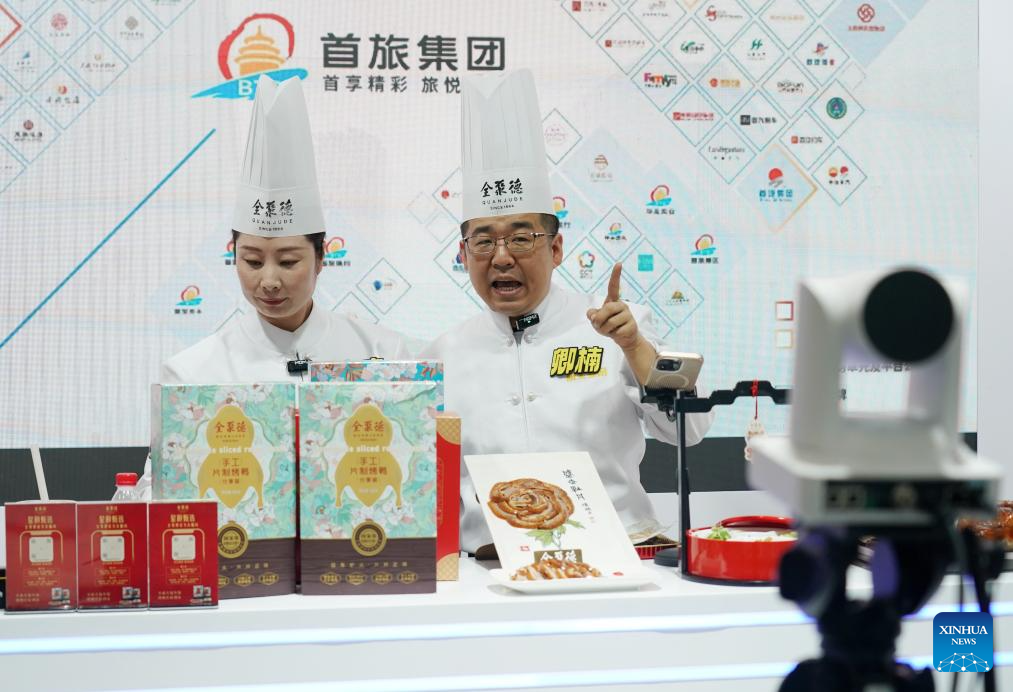 Exhibitors promote their products through livestreams during the 2024 China International Fair for Trade in Services (CIFTIS) at the Shougang Park in Beijing, capital of China, Sept. 12, 2024. Themed "Global Services, Shared Prosperity," the 2024 CIFTIS opened at the China National Convention Center and the Shougang Park in Beijing on Thursday. (Xinhua/Zhang Chenlin)