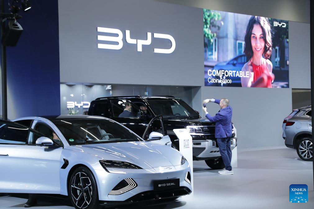 People visit the booth of BYD at the Automechanika in Frankfurt, Germany, Sept. 11, 2024. A leading trade fair for the aftermarket sector of the auto industry, Automechanika, kicked off on Tuesday, highlighting electrification and sustainability.