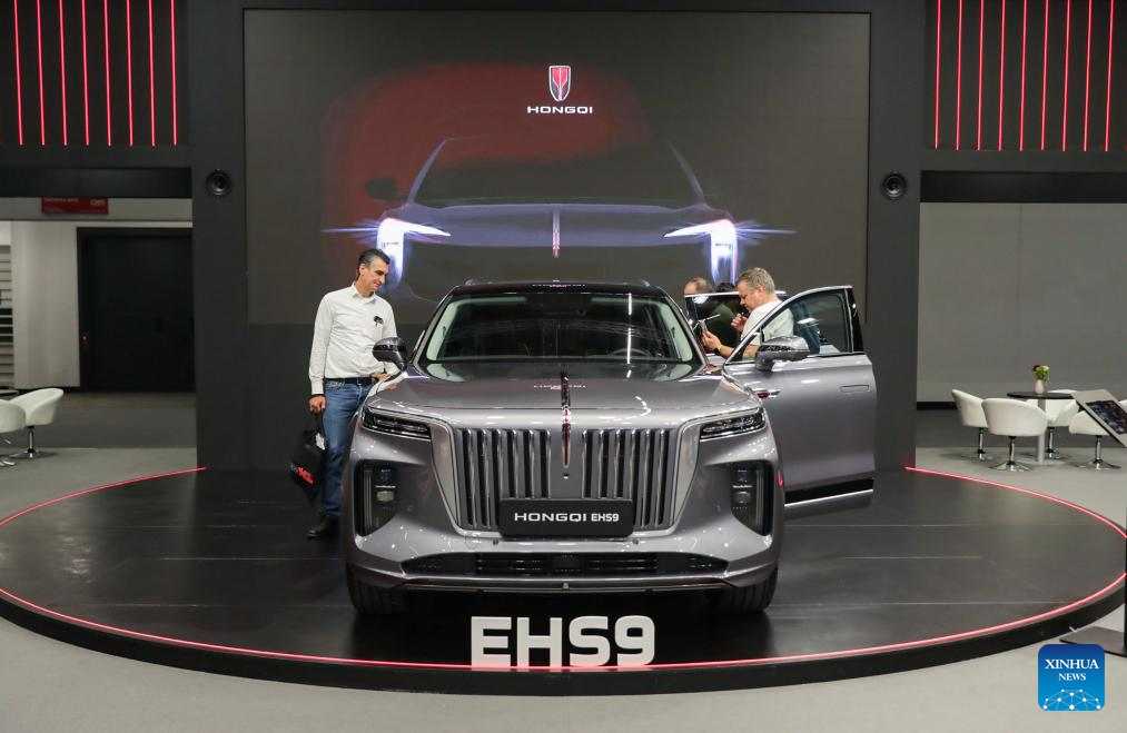 People visit the booth of Hongqi at the Automechanika in Frankfurt, Germany, Sept. 11, 2024. A leading trade fair for the aftermarket sector of the auto industry, Automechanika, kicked off on Tuesday, highlighting electrification and sustainability.