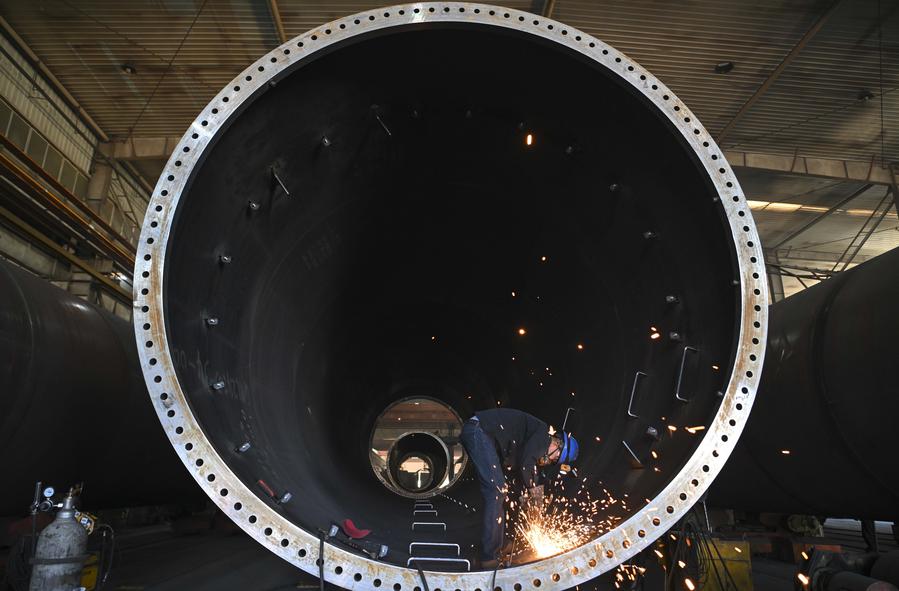 A worker welds at a wind power equipment manufacturing enterprise at the high-tech industrial development zone in Hami City, northwest China's Xinjiang Uygur Autonomous Region, Sept. 10, 2024. (Xinhua/Hu Huhu)