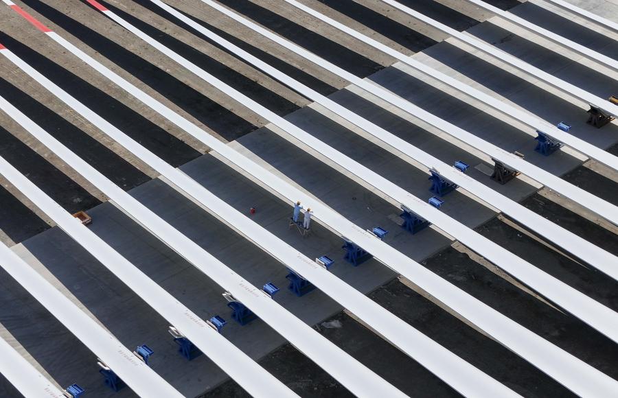 An aerial drone photo taken on Sept. 10, 2024 shows workers checking wind turbine blades at an industrial park in Kazak Autonomous County of Barkol, northwest China's Xinjiang Uygur Autonomous Region. (Xinhua/Hu Huhu)