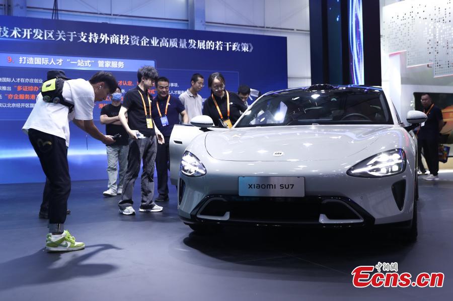 Visitors view a Xiaomi new energy car during the 2024 China International Fair for Trade in Services (CIFTIS) at the Shougang Park in Beijing, Sept. 12, 2024. (Photo: China News Service/Zhang Xiangyi)