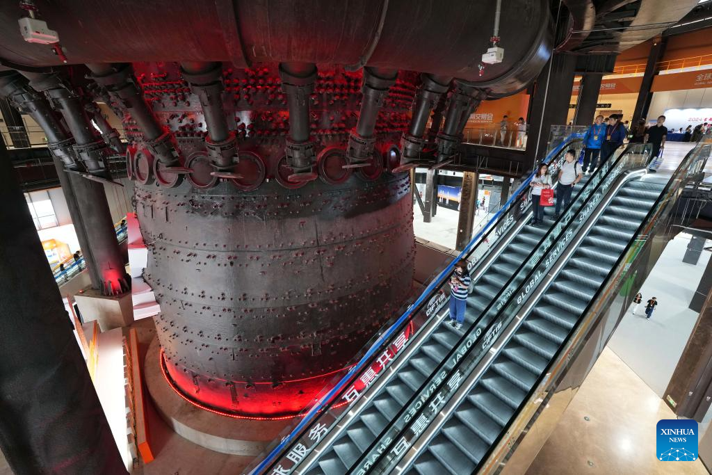 A visitor learns about a hybrid new energy motor during the 2024 China International Fair for Trade in Services (CIFTIS) at the Shougang Park in Beijing, capital of China, Sept. 13, 2024. Themed "Global Services, Shared Prosperity," the 2024 CIFTIS is held at the China National Convention Center and the Shougang Park in Beijing from Sept. 12 to 16. (Xinhua/Chen Zhonghao)