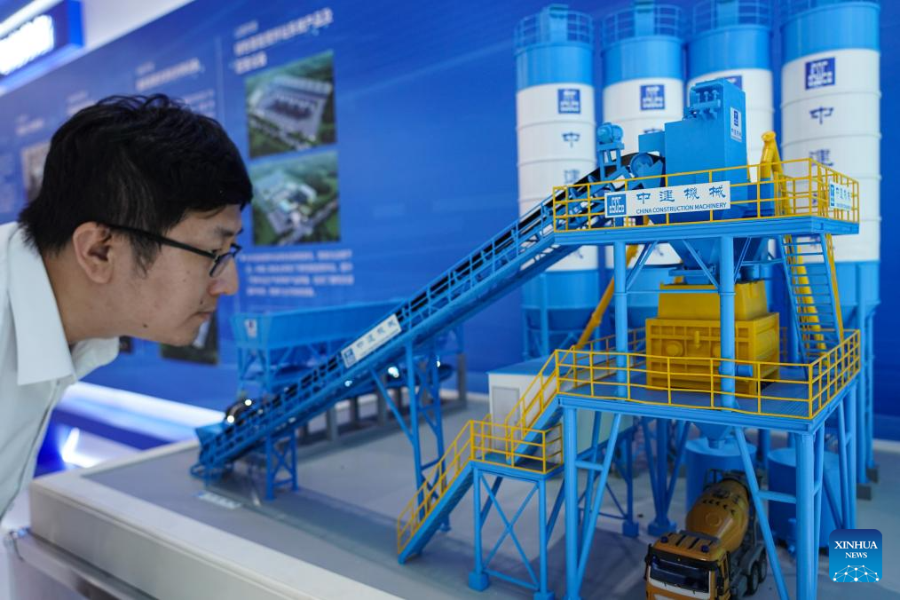 A man looks at a model of AI-powered cement mixing station displayed during the 2024 China International Fair for Trade in Services (CIFTIS) at the Shougang Park in Beijing, capital of China, Sept. 13, 2024. Themed "Global Services, Shared Prosperity," the 2024 CIFTIS is held at the China National Convention Center and the Shougang Park in Beijing from Sept. 12 to 16. (Xinhua/Chen Zhonghao)