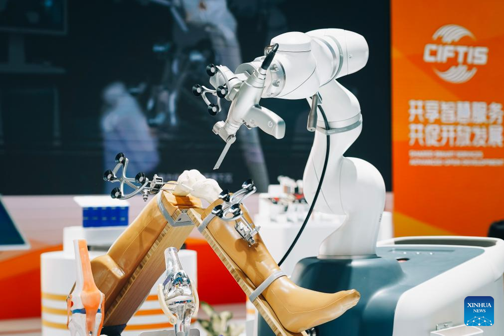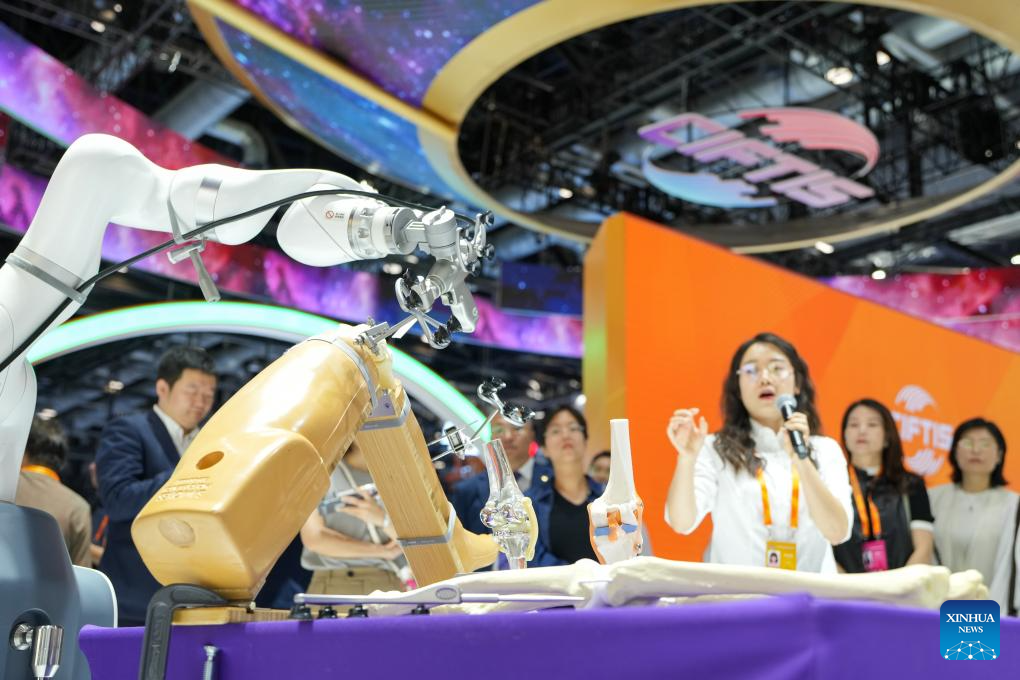 Visitors watch an AI-powered orthopedic surgical robot during the 2024 China International Fair for Trade in Services (CIFTIS) at the China National Convention Center in Beijing, capital of China, Sept. 13, 2024. Themed "Global Services, Shared Prosperity," the 2024 CIFTIS is held at the China National Convention Center and the Shougang Park in Beijing from Sept. 12 to 16. (Xinhua/Ju Huanzong)
