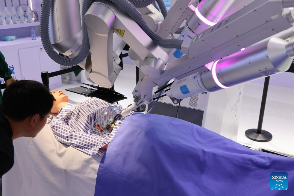 A visitor looks at the SHURUI Single-port Endoscopic Surgical System during the 2024 China International Fair for Trade in Services (CIFTIS) in Beijing, capital of China, Sept. 13, 2024. Themed "Global Services, Shared Prosperity," the 2024 CIFTIS is held at the China National Convention Center and the Shougang Park in Beijing from Sept. 12 to 16. (Xinhua/Qi Xiaoyi)