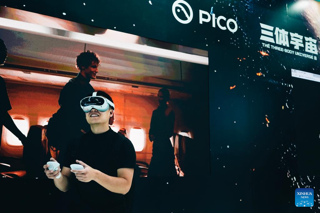 A visitor tries PICO 4 Ultra during the 2024 China International Fair for Trade in Services (CIFTIS) at the Shougang Park in Beijing, capital of China, Sept. 13, 2024. Themed "Global Services, Shared Prosperity," the 2024 CIFTIS is held at the China National Convention Center and the Shougang Park in Beijing from Sept. 12 to 16. (Xinhua/Cao Mengyao)