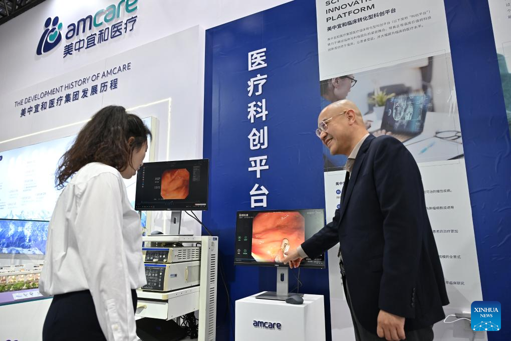A visitor learns about an AI-powered gastrointestinal endoscopy medical platform during the 2024 China International Fair for Trade in Services (CIFTIS) at the Shougang Park in Beijing, capital of China, Sept. 13, 2024. Themed "Global Services, Shared Prosperity," the 2024 CIFTIS is held at the China National Convention Center and the Shougang Park in Beijing from Sept. 12 to 16. (Xinhua/Li Xin)