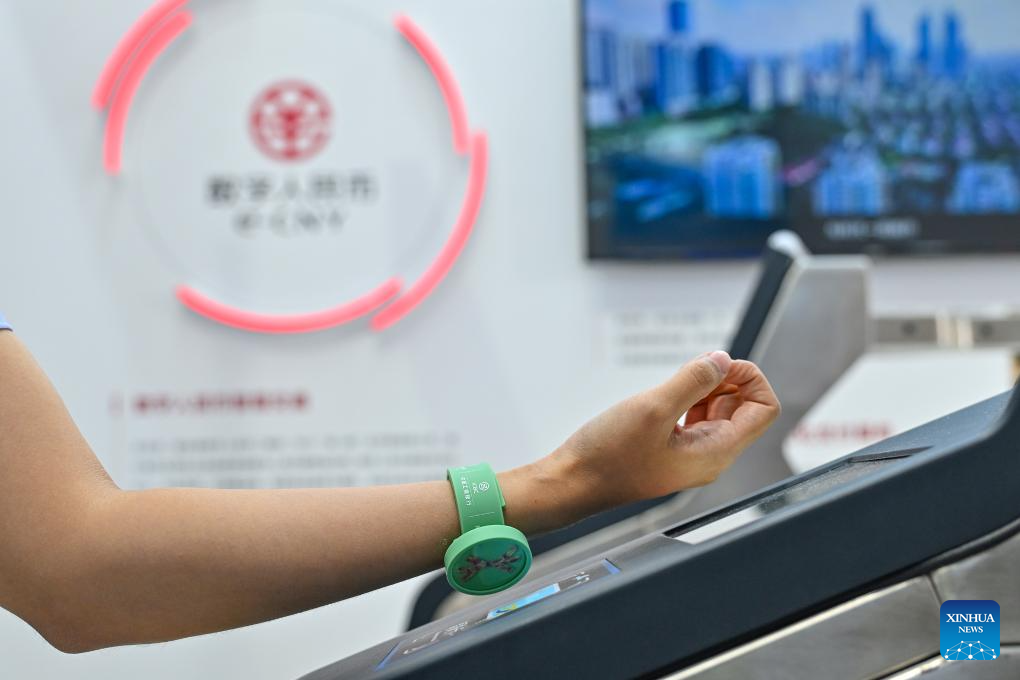 A staff member demonstrates the e-CNY payment system for subway entrance during the 2024 China International Fair for Trade in Services (CIFTIS) at the Shougang Park in Beijing, capital of China, Sept. 13, 2024. Themed "Global Services, Shared Prosperity," the 2024 CIFTIS is held at the China National Convention Center and the Shougang Park in Beijing from Sept. 12 to 16. (Xinhua/Li Xin)