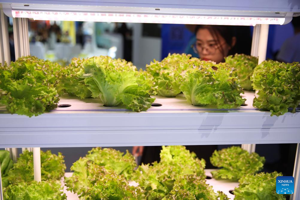 A woman looks at a home-based plant cultivation device displayed during the 2024 China International Fair for Trade in Services (CIFTIS) in Beijing, capital of China, Sept. 13, 2024. Themed "Global Services, Shared Prosperity," the 2024 CIFTIS is held at the China National Convention Center and the Shougang Park in Beijing from Sept. 12 to 16. (Xinhua/Zou Guangping)