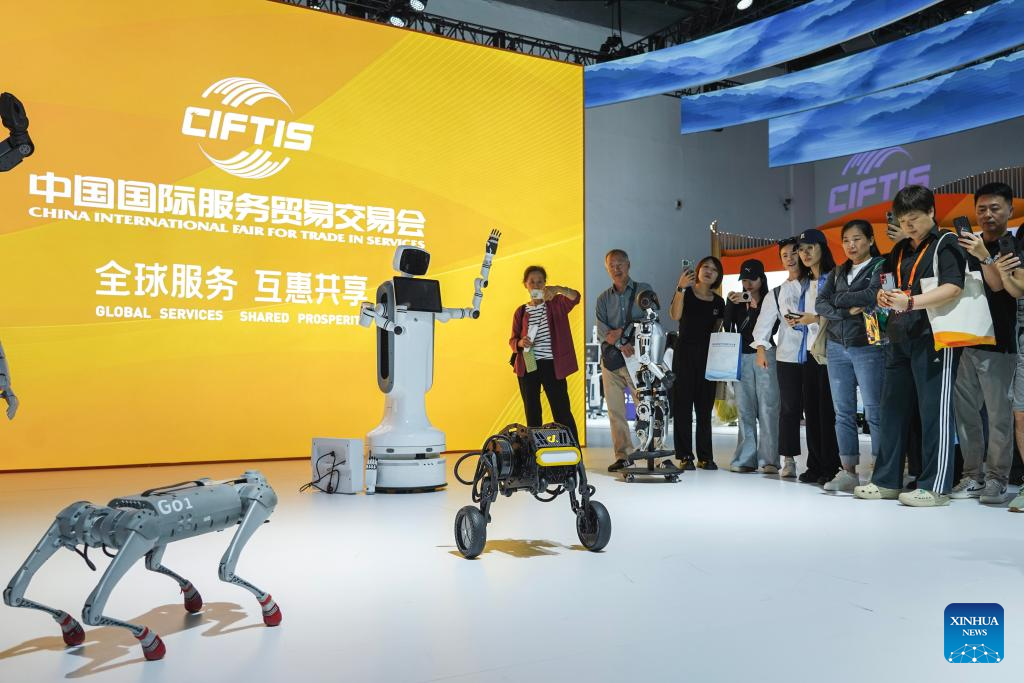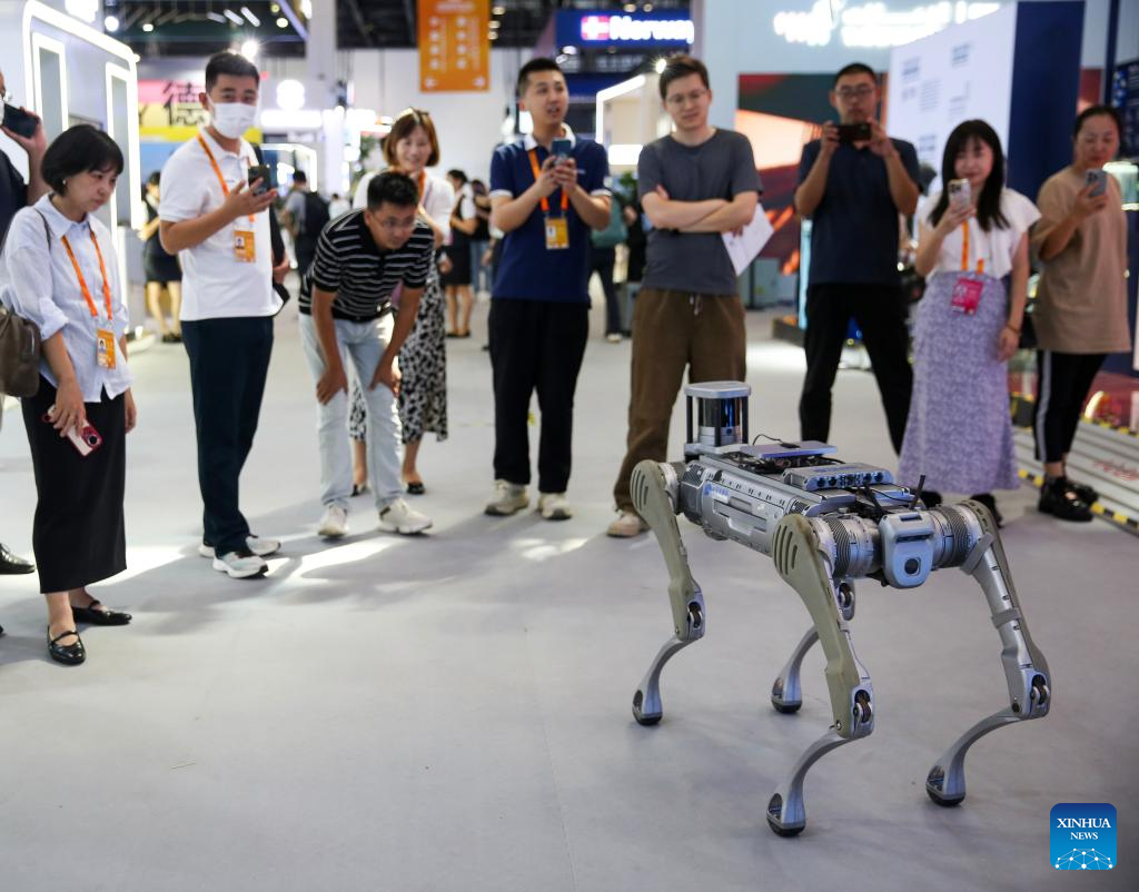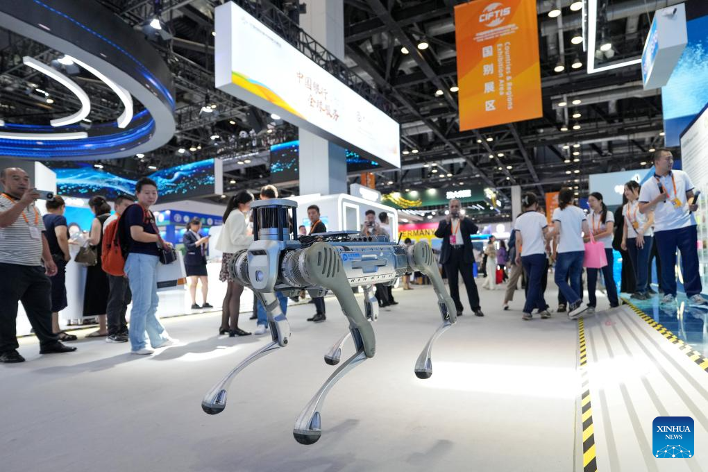 People look at a robotic dog displayed during the 2024 China International Fair for Trade in Services (CIFTIS) at the China National Convention Center in Beijing, capital of China, Sept. 13, 2024. Themed "Global Services, Shared Prosperity," the 2024 CIFTIS is held at the China National Convention Center and the Shougang Park in Beijing from Sept. 12 to 16. (Xinhua/Ju Huanzong)