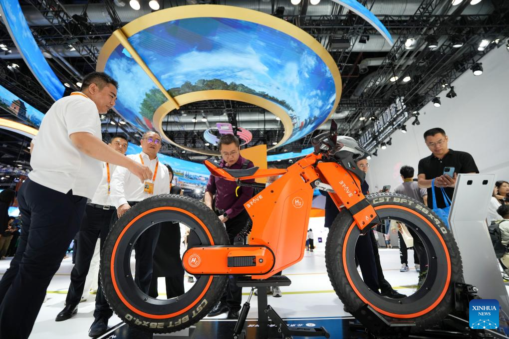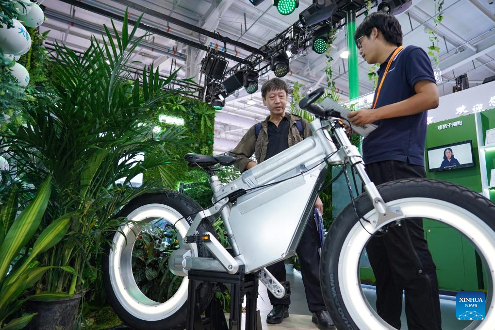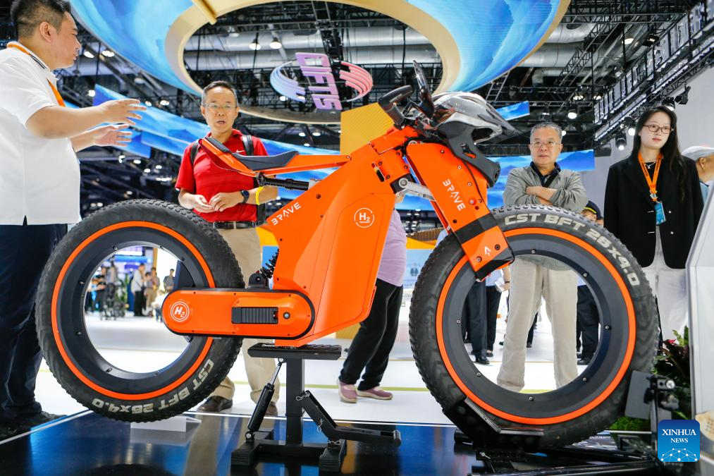 People look at a hydrogen-powered motorcycle displayed during the 2024 China International Fair for Trade in Services (CIFTIS) at the China National Convention Center in Beijing, capital of China, Sept. 13, 2024. Themed "Global Services, Shared Prosperity," the 2024 CIFTIS is held at the China National Convention Center and the Shougang Park in Beijing from Sept. 12 to 16. (Xinhua/Ju Huanzong)