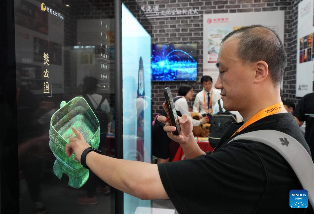 A visitor interacts with a digital holographic screen during the 2024 China International Fair for Trade in Services (CIFTIS) at the Shougang Park in Beijing, capital of China, Sept. 13, 2024. Themed "Global Services, Shared Prosperity," the 2024 CIFTIS is held at the China National Convention Center and the Shougang Park in Beijing from Sept. 12 to 16. (Xinhua/Chen Yehua)