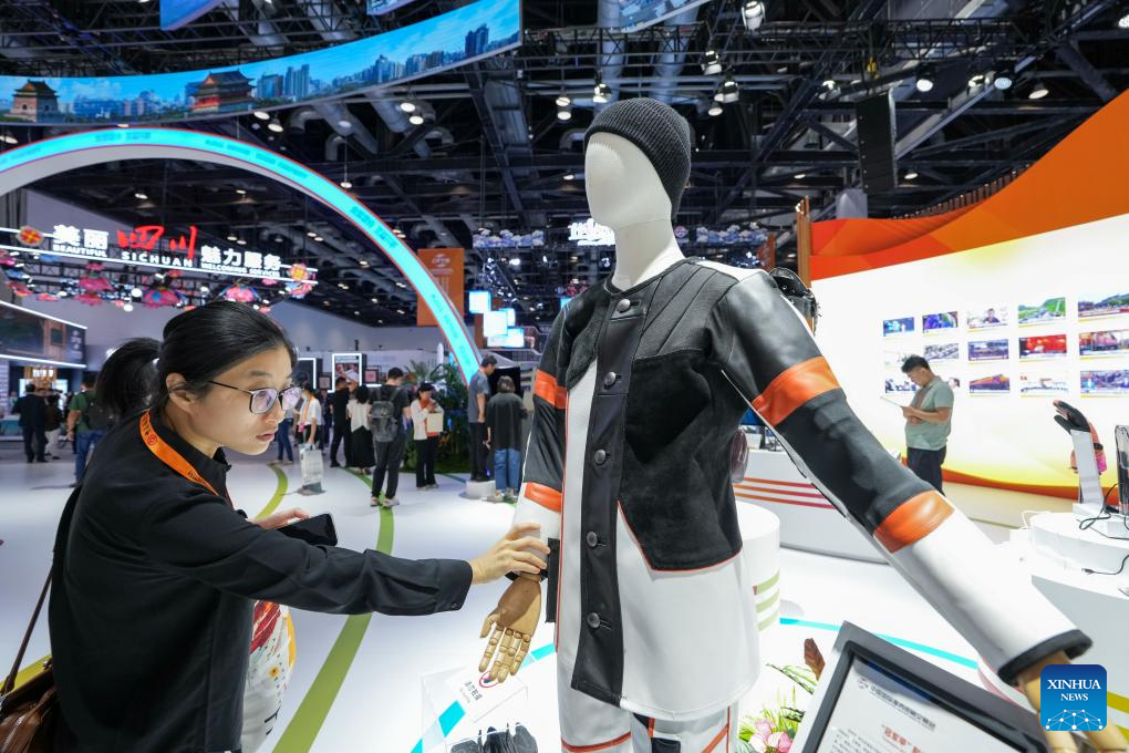 A woman learns about a leather outfit displayed during the 2024 China International Fair for Trade in Services (CIFTIS) at the China National Convention Center in Beijing, capital of China, Sept. 13, 2024. Themed "Global Services, Shared Prosperity," the 2024 CIFTIS is held at the China National Convention Center and the Shougang Park in Beijing from Sept. 12 to 16. (Xinhua/Ju Huanzong)
