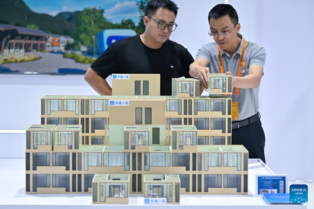 A man learns about a construction model during the 2024 China International Fair for Trade in Services (CIFTIS) at the Shougang Park in Beijing, capital of China, Sept. 13, 2024. Themed "Global Services, Shared Prosperity," the 2024 CIFTIS is held at the China National Convention Center and the Shougang Park in Beijing from Sept. 12 to 16. (Xinhua/Li Xin)