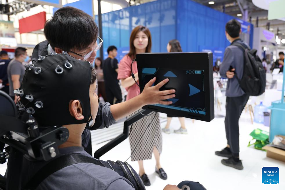 A staff member introduces a brain nerve rehabilitation product to a visitor during the 2024 China International Fair for Trade in Services (CIFTIS) in Beijing, capital of China, Sept. 13, 2024. Themed "Global Services, Shared Prosperity," the 2024 CIFTIS is held at the China National Convention Center and the Shougang Park in Beijing from Sept. 12 to 16. (Xinhua/Qi Xiaoyi)