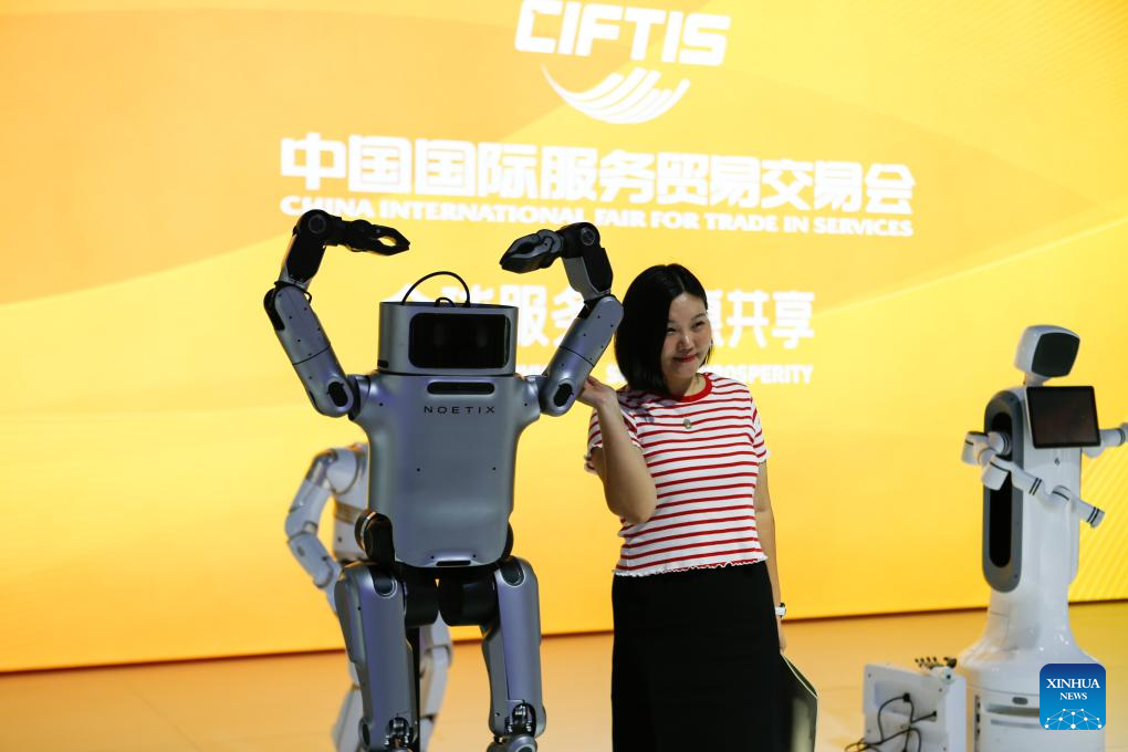 A visitor poses for photos with a robot during the 2024 China International Fair for Trade in Services (CIFTIS) at the China National Convention Center in Beijing, capital of China, Sept. 13, 2024. Themed "Global Services, Shared Prosperity," the 2024 CIFTIS is held at the China National Convention Center and the Shougang Park in Beijing from Sept. 12 to 16. (Xinhua/Ding Hongfa)