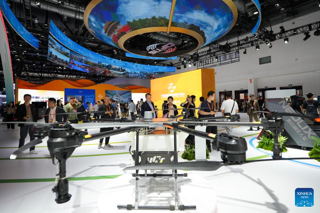 People look at a drone displayed during the 2024 China International Fair for Trade in Services (CIFTIS) at the China National Convention Center in Beijing, capital of China, Sept. 13, 2024. Themed "Global Services, Shared Prosperity," the 2024 CIFTIS is held at the China National Convention Center and the Shougang Park in Beijing from Sept. 12 to 16. (Xinhua/Ju Huanzong)