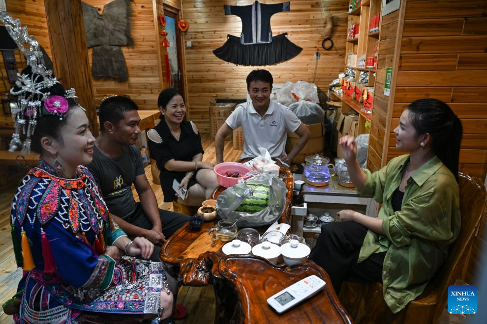 Wu Chunyue (1st L, front) talks with tourists at a teahouse in Chengyang Eight Villages in Sanjiang Dong Autonomous County, south China's Guangxi Zhuang Autonomous Region, Aug. 28, 2024.(Xinhua/Zhang Ailin)