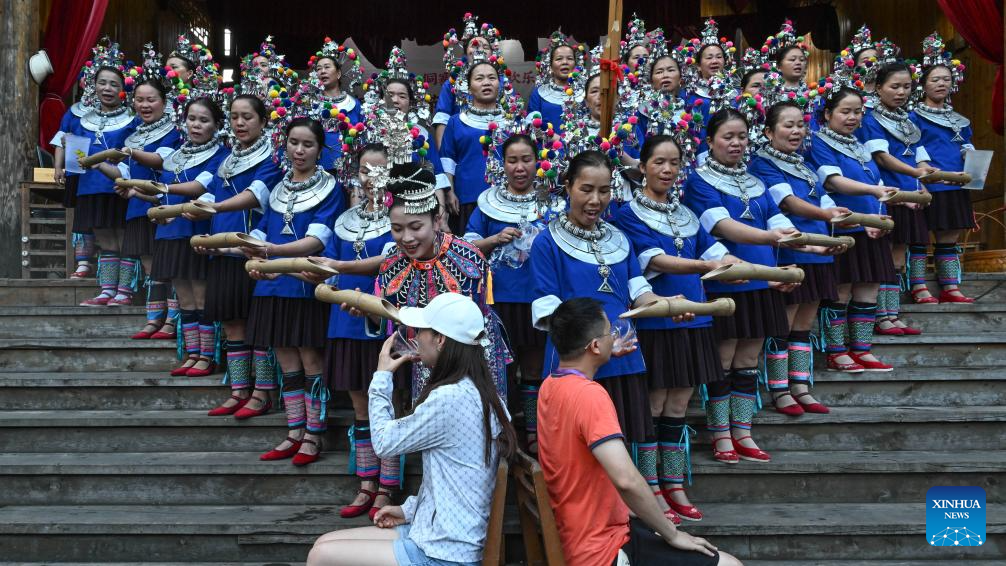 Tourists enjoy folk customs performance of the Dong ethnic group in Chengyang Eight Villages in Sanjiang Dong Autonomous County, south China's Guangxi Zhuang Autonomous Region, Aug. 28, 2024.(Xinhua/Zhang Ailin)
