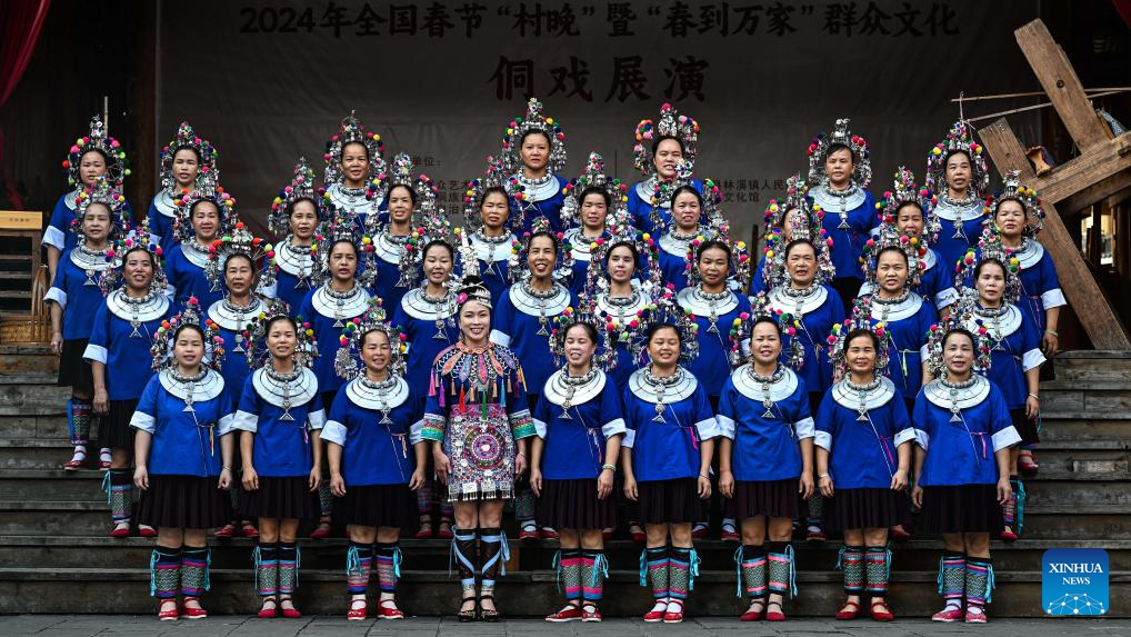 Wu Chunyue (C, front) and local people perform Grand Song of the Dong ethnic group to welcome tourists before a banquet in Chengyang Eight Villages in Sanjiang Dong Autonomous County, south China's Guangxi Zhuang Autonomous Region, Aug. 28, 2024.(Xinhua/Zhang Ailin)