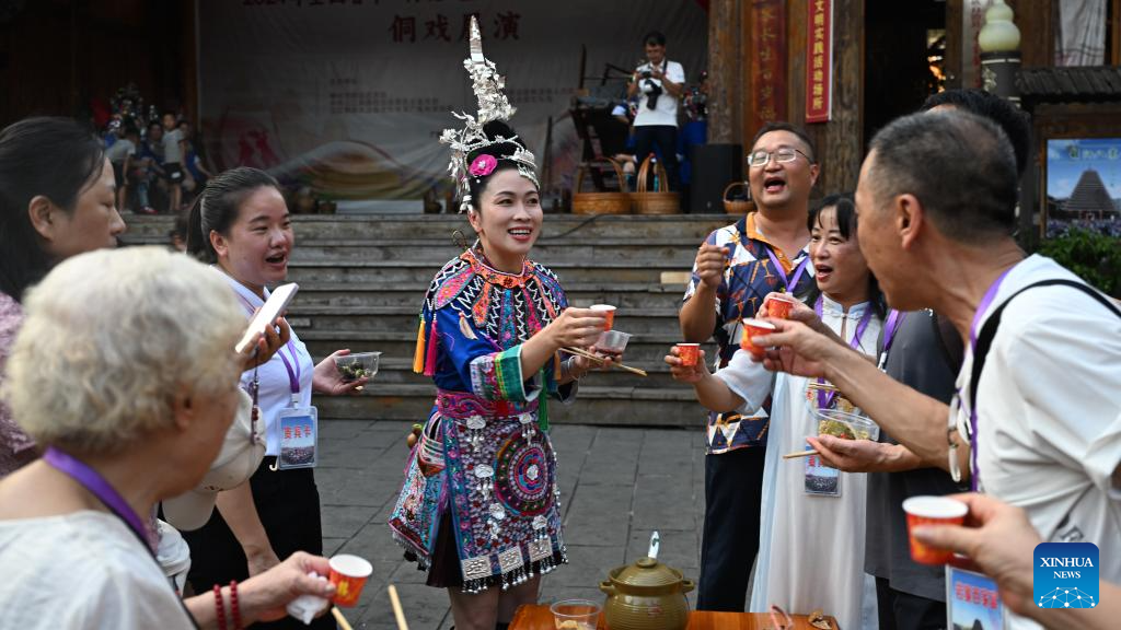 Wu Chunyue (1st R) serves tourists with oil tea in Sanjiang Dong Autonomous County, south China's Guangxi Zhuang Autonomous Region, Aug. 30, 2024.(Xinhua/Zhang Ailin)