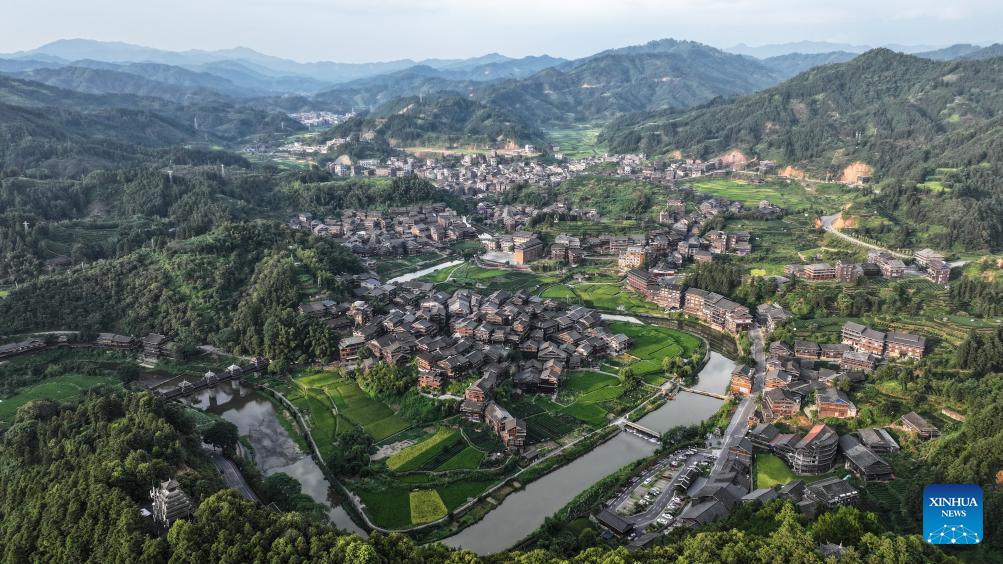 An aerial drone photo taken on Aug. 30, 2024 shows a view of Chengyang Eight Villages in Sanjiang Dong Autonomous County, south China's Guangxi Zhuang Autonomous Region.(Xinhua/Zhang Ailin)