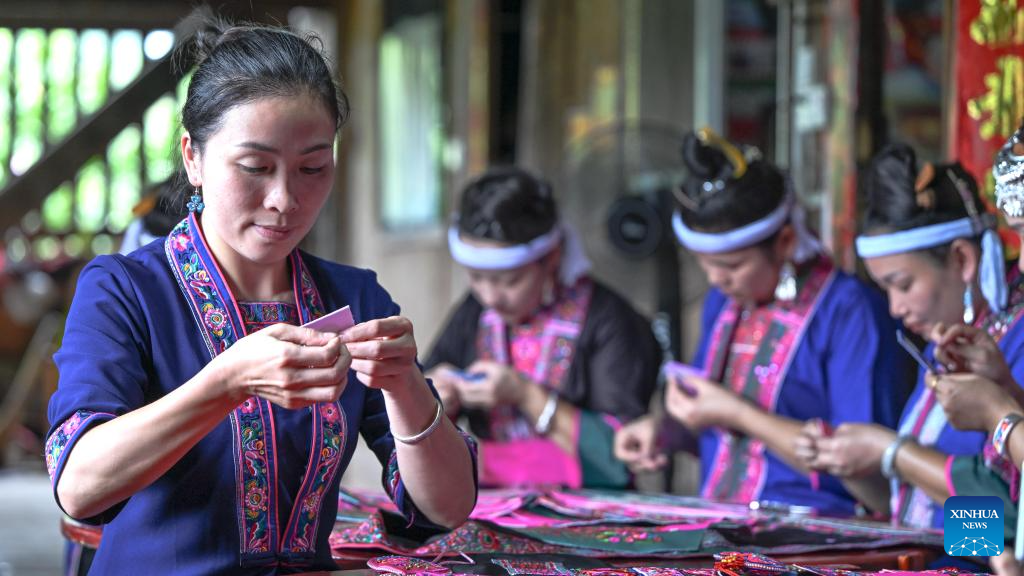 Wu Chunyue (1st L, front) learns Dong embroidery making in Sanjiang Dong Autonomous County, south China's Guangxi Zhuang Autonomous Region, Aug. 30, 2024.(Xinhua/Zhang Ailin)