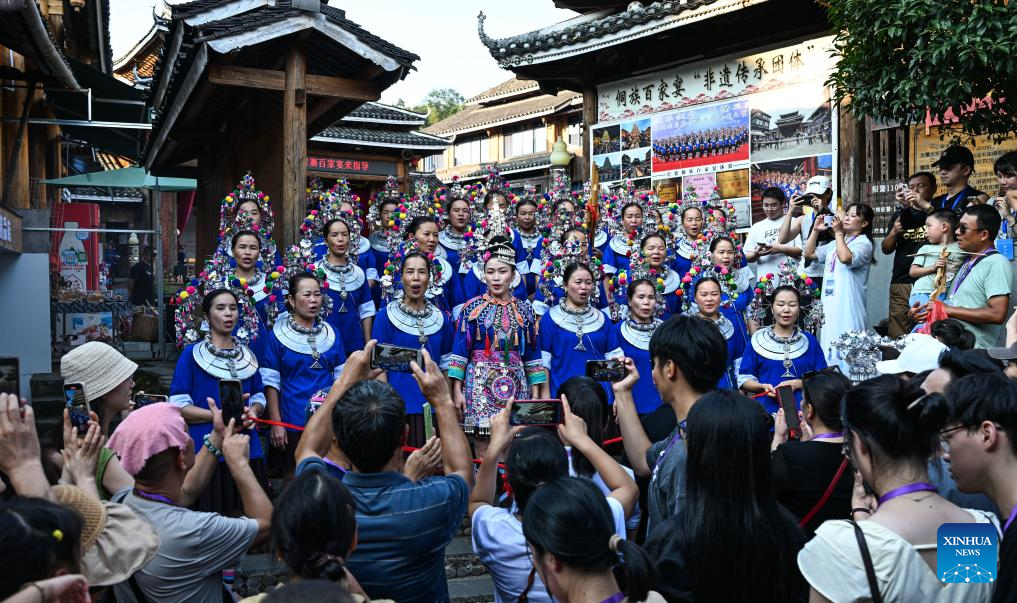 Wu Chunyue (C) and local people sing songs to welcome tourists before a banquet in Chengyang Eight Villages in Sanjiang Dong Autonomous County, south China's Guangxi Zhuang Autonomous Region, Aug. 28, 2024.(Xinhua/Zhang Ailin)