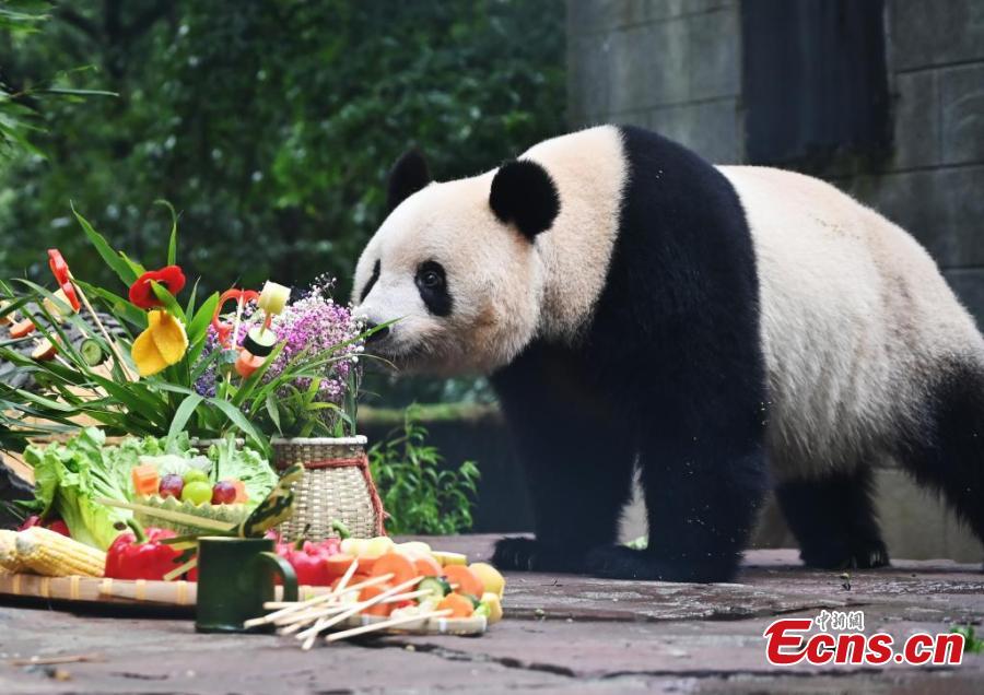 A giant panda enjoys a special birthday cake during a group party at the Bifengxia Giant Panda Base in Ya'an, southwest China's Sichuan Province, Sept. 13, 2024. (Photo: China News Service/An Yuan)