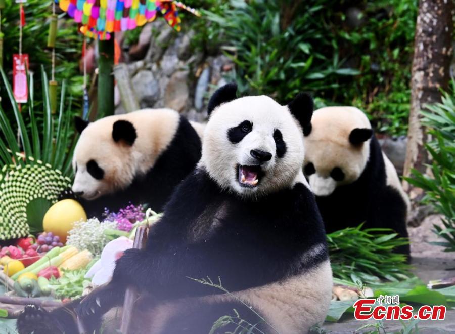 Giant pandas enjoy a special birthday cake during a group party at the Bifengxia Giant Panda Base in Ya'an, southwest China's Sichuan Province, Sept. 13, 2024. (Photo: China News Service/An Yuan)