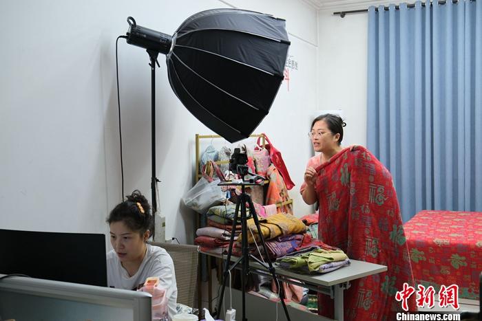 A livestreamer sells towel coverlets via a livestream session in Gaoyang county, Baoding city, north China's Hebei Province. (Photo/Li Taiyuan)