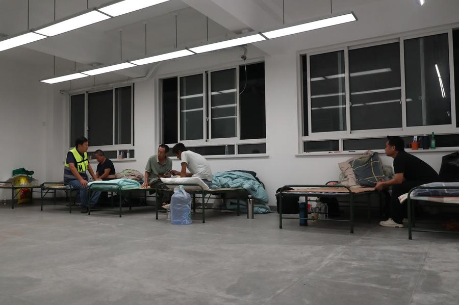 A staff member (L) talks with workers at a temporary relocation site in Pudong, east China's Shanghai, Sept. 15, 2024. (Xinhua/Fang Zhe)