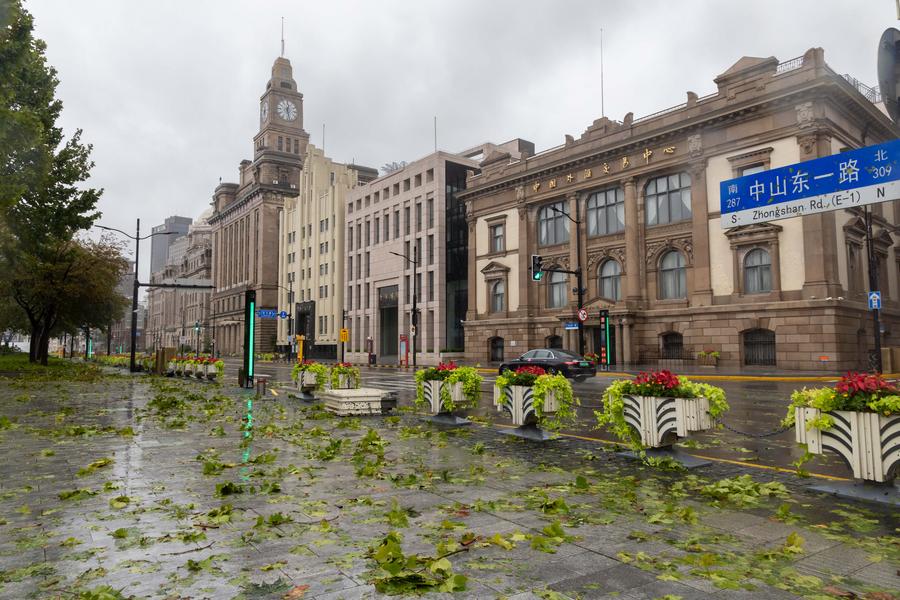 Fallen tree branches and leaves are pictured near the Bund in Shanghai, east China, Sept. 16, 2024. (Xinhua/Wang Xiang)
