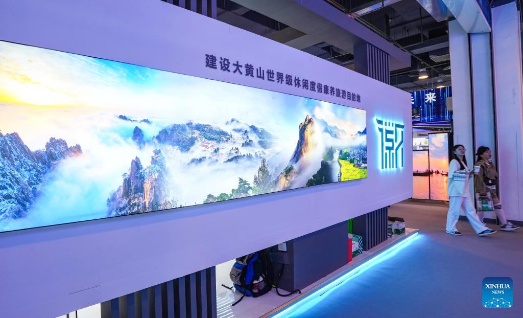 Visitors walk pass the booth of Anhui Province during the 2024 China International Fair for Trade in Services (CIFTIS) at the China National Convention Center in Beijing, capital of China, Sept. 16, 2024. The Cultural &Tourism Service thematic exhibition area of this year's CIFTIS reflects the integration of technology and culture. The exhibitions enable multidimensional presentations with new technologies such as immersive digital spaces, virtual reality (VR), augmented reality (AR), and holographic projection. (Xinhua/Chen Yehua)