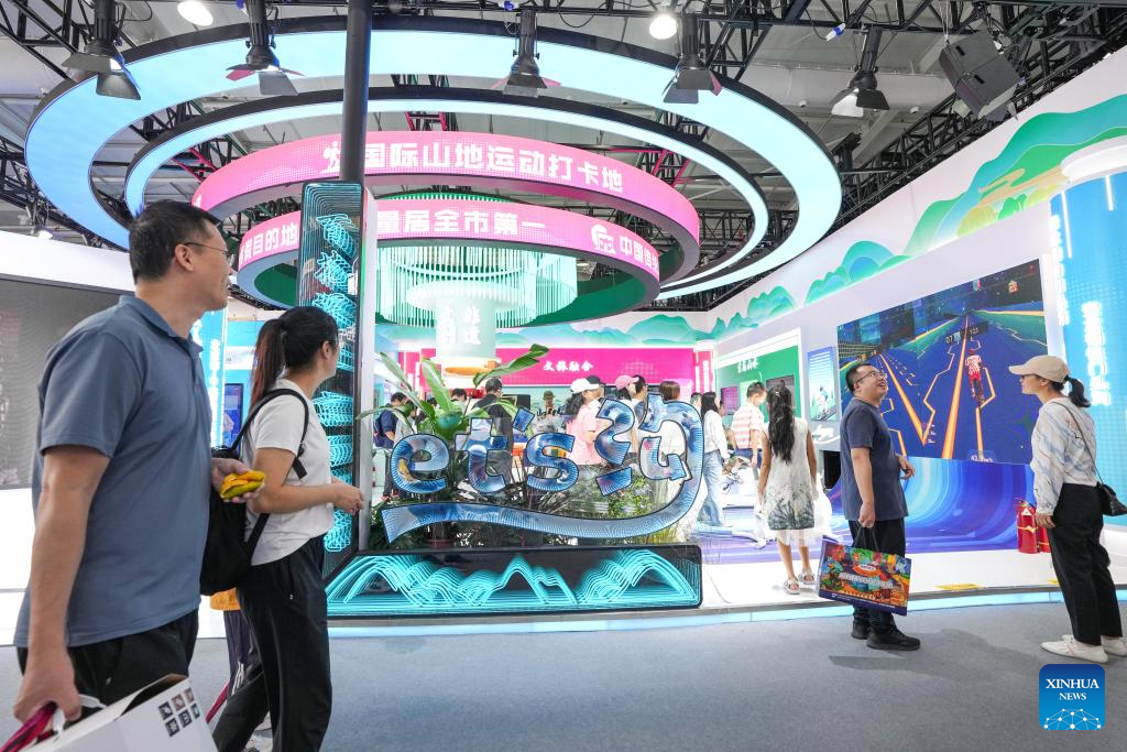 Visitors walk pass the booth of Mentougou District of Beijing during the 2024 China International Fair for Trade in Services (CIFTIS) in the Cultural &Tourism Service thematic exhibition area at the Shougang Park in Beijing, capital of China, Sept. 15, 2024. The Cultural &Tourism Service thematic exhibition area of this year's CIFTIS reflects the integration of technology and culture. The exhibitions enable multidimensional presentations with new technologies such as immersive digital spaces, virtual reality (VR), augmented reality (AR), and holographic projection. (Xinhua/Chen Yehua)