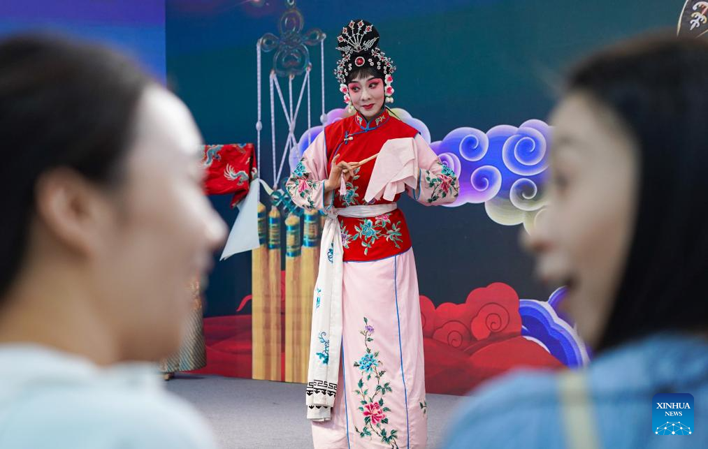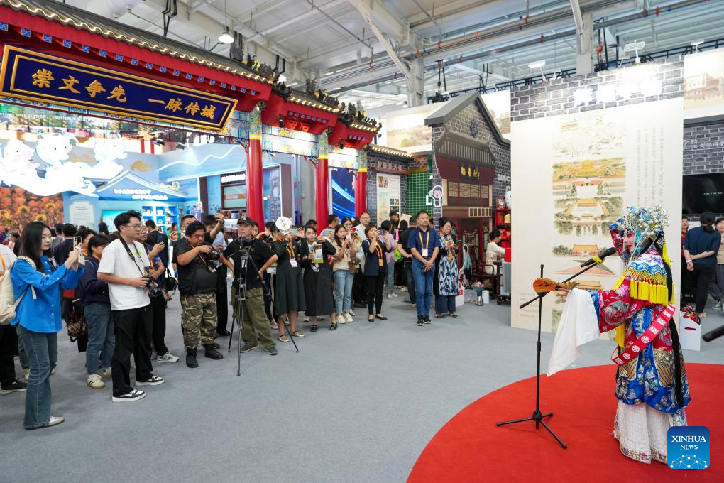 Visitors watch a performance at the booth of Dongcheng District of Beijing during the 2024 China International Fair for Trade in Services (CIFTIS) in the Cultural &Tourism Service thematic exhibition area at the Shougang Park in Beijing, capital of China, Sept. 12, 2024. The Cultural &Tourism Service thematic exhibition area of this year's CIFTIS reflects the integration of technology and culture. The exhibitions enable multidimensional presentations with new technologies such as immersive digital spaces, virtual reality (VR), augmented reality (AR), and holographic projection. (Xinhua/Ju Huanzong)