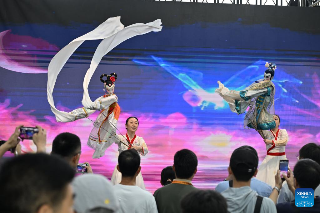 Visitors watch a puppet performance during the 2024 China International Fair for Trade in Services (CIFTIS) in the Cultural &Tourism Service thematic exhibition area at the Shougang Park in Beijing, capital of China, Sept. 16, 2024. The Cultural &Tourism Service thematic exhibition area of this year's CIFTIS reflects the integration of technology and culture. The exhibitions enable multidimensional presentations with new technologies such as immersive digital spaces, virtual reality (VR), augmented reality (AR), and holographic projection. (Xinhua/Li Xin)