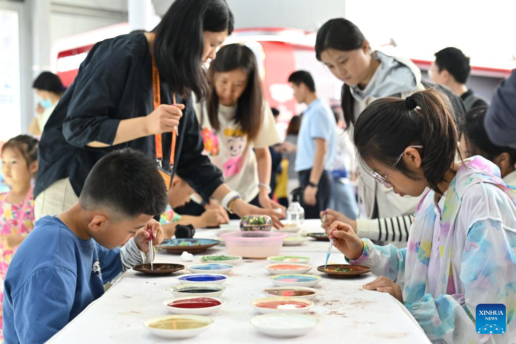 Children try their hands with cloisonne enameling skills during the 2024 China International Fair for Trade in Services (CIFTIS) in the Cultural &Tourism Service thematic exhibition area at the Shougang Park in Beijing, capital of China, Sept. 16, 2024. The Cultural &Tourism Service thematic exhibition area of this year's CIFTIS reflects the integration of technology and culture. The exhibitions enable multidimensional presentations with new technologies such as immersive digital spaces, virtual reality (VR), augmented reality (AR), and holographic projection. (Xinhua/Li Xin)
