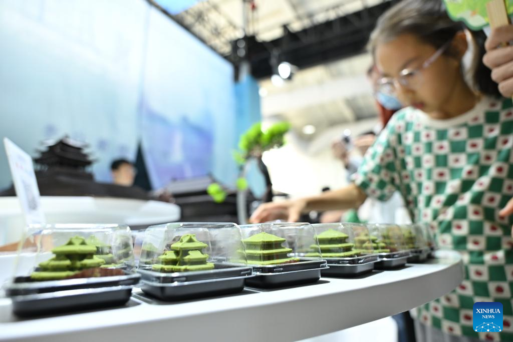 Chocolate products resembling architectures on the Beijing Central Axis are pictured during the 2024 China International Fair for Trade in Services (CIFTIS) in the Cultural &Tourism Service thematic exhibition area at the Shougang Park in Beijing, capital of China, Sept. 16, 2024. The Cultural &Tourism Service thematic exhibition area of this year's CIFTIS reflects the integration of technology and culture. The exhibitions enable multidimensional presentations with new technologies such as immersive digital spaces, virtual reality (VR), augmented reality (AR), and holographic projection. (Xinhua/Li Xin)