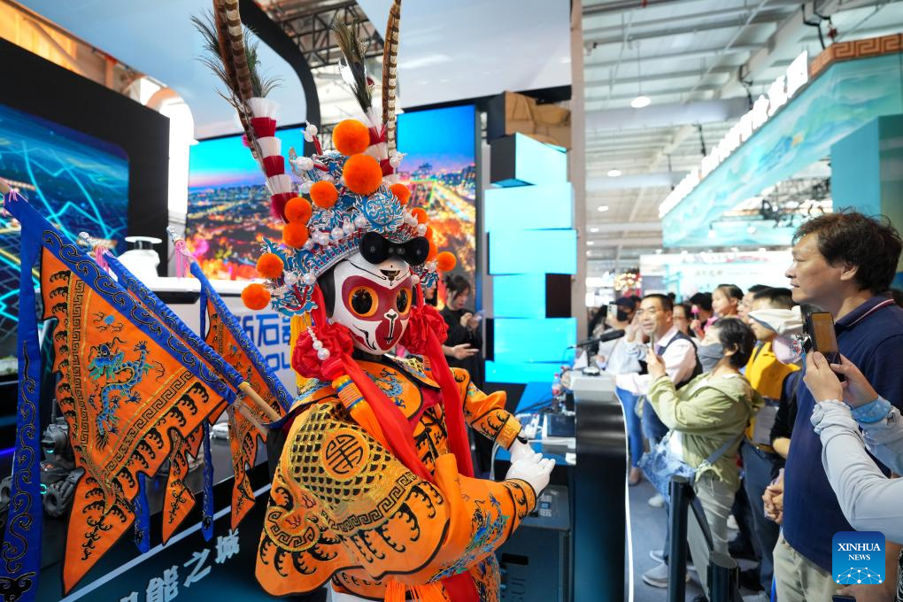 A creative cultural product themed on Chinese mythological figure the Monkey King or Sun Wukong, is pictured during the 2024 China International Fair for Trade in Services (CIFTIS) at the China National Convention Center in Beijing, capital of China, Sept. 12, 2024. The Cultural &Tourism Service thematic exhibition area of this year's CIFTIS reflects the integration of technology and culture. The exhibitions enable multidimensional presentations with new technologies such as immersive digital spaces, virtual reality (VR), augmented reality (AR), and holographic projection. (Xinhua/Ding Hongfa)