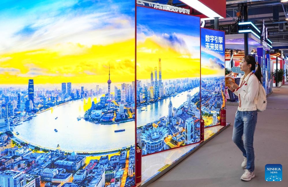 A visitor walks pass the booth of Shanghai during the 2024 China International Fair for Trade in Services (CIFTIS) at the China National Convention Center in Beijing, capital of China, Sept. 16, 2024. The Cultural &Tourism Service thematic exhibition area of this year's CIFTIS reflects the integration of technology and culture. The exhibitions enable multidimensional presentations with new technologies such as immersive digital spaces, virtual reality (VR), augmented reality (AR), and holographic projection. (Xinhua/Chen Yehua)