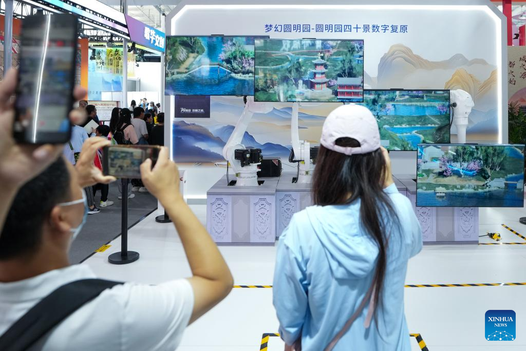 Visitors take photos of the display of digitally restored Forty Scenes of the Yuanmingyuan, or the Old Summer Palace, during the 2024 China International Fair for Trade in Services (CIFTIS) in the Cultural &Tourism Service thematic exhibition area at the Shougang Park in Beijing, capital of China, Sept. 16, 2024. The Cultural &Tourism Service thematic exhibition area of this year's CIFTIS reflects the integration of technology and culture. The exhibitions enable multidimensional presentations with new technologies such as immersive digital spaces, virtual reality (VR), augmented reality (AR), and holographic projection. (Xinhua/Lu Yang)